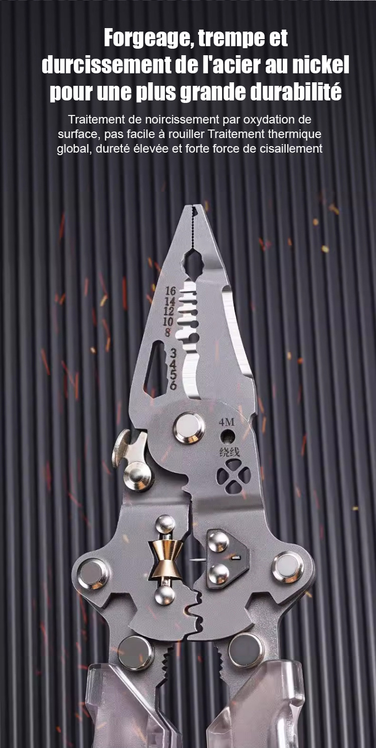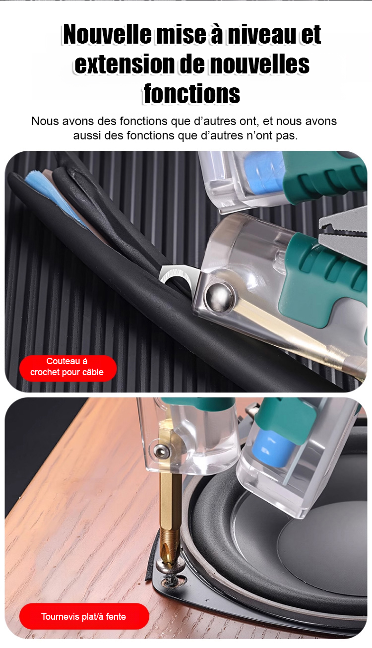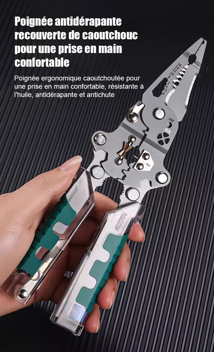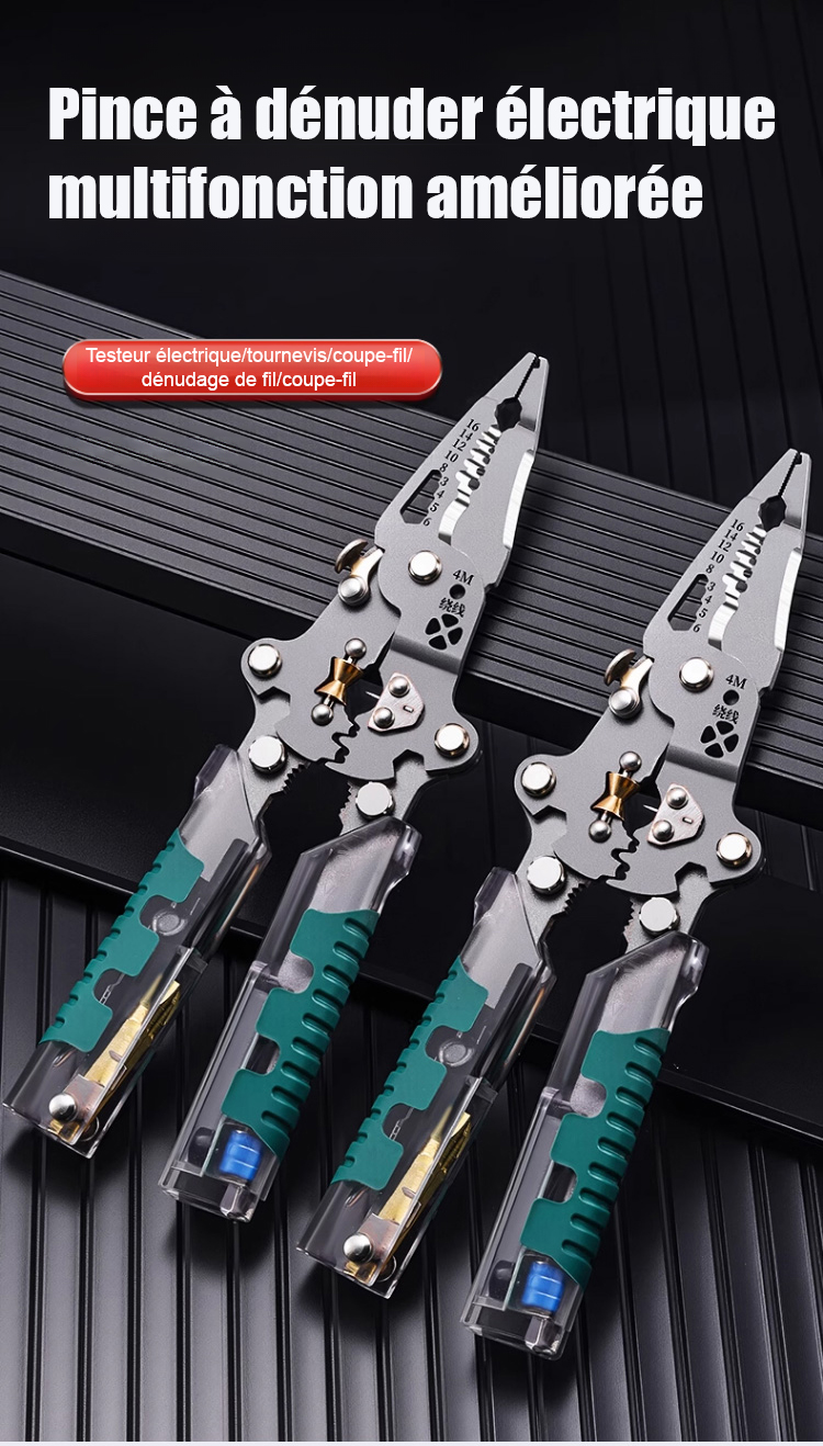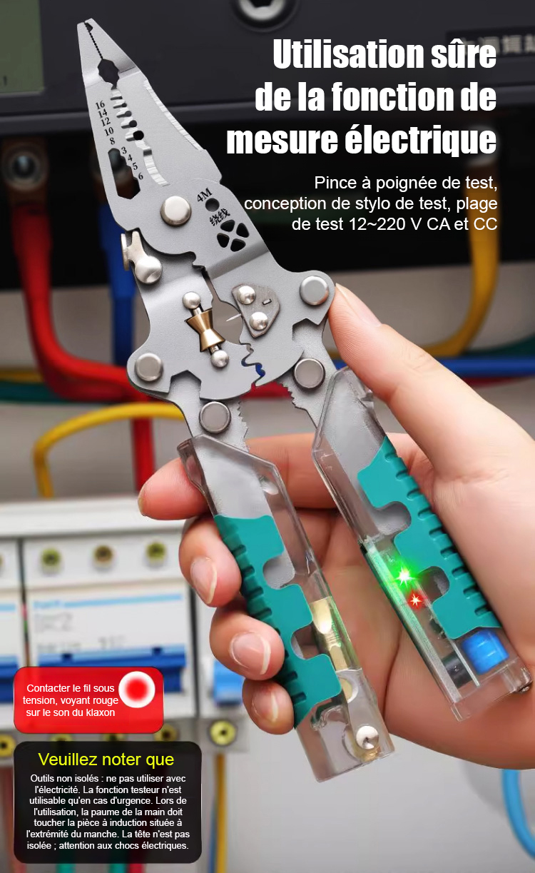 Tout-en-un ! Tournevis pliant, testeur de tension et pince à dénuder.